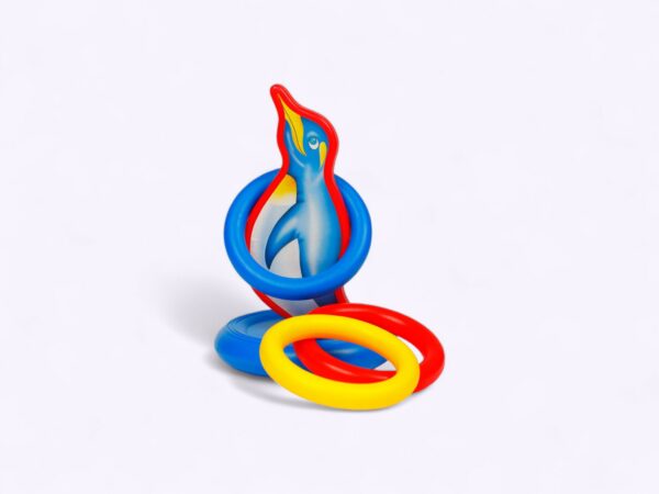 - Fun and colorful ring toss game with a cute penguin target